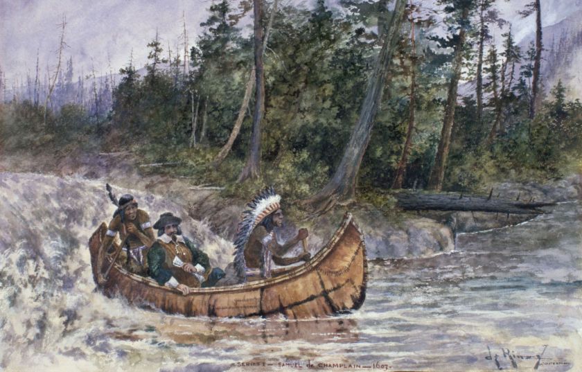 Bibliothèque et Archives Canada Aquarelle intitulée «Champlain en canot indien, 1603», réalisée par John Henry de Rinzy entre 1897 et 1930.
